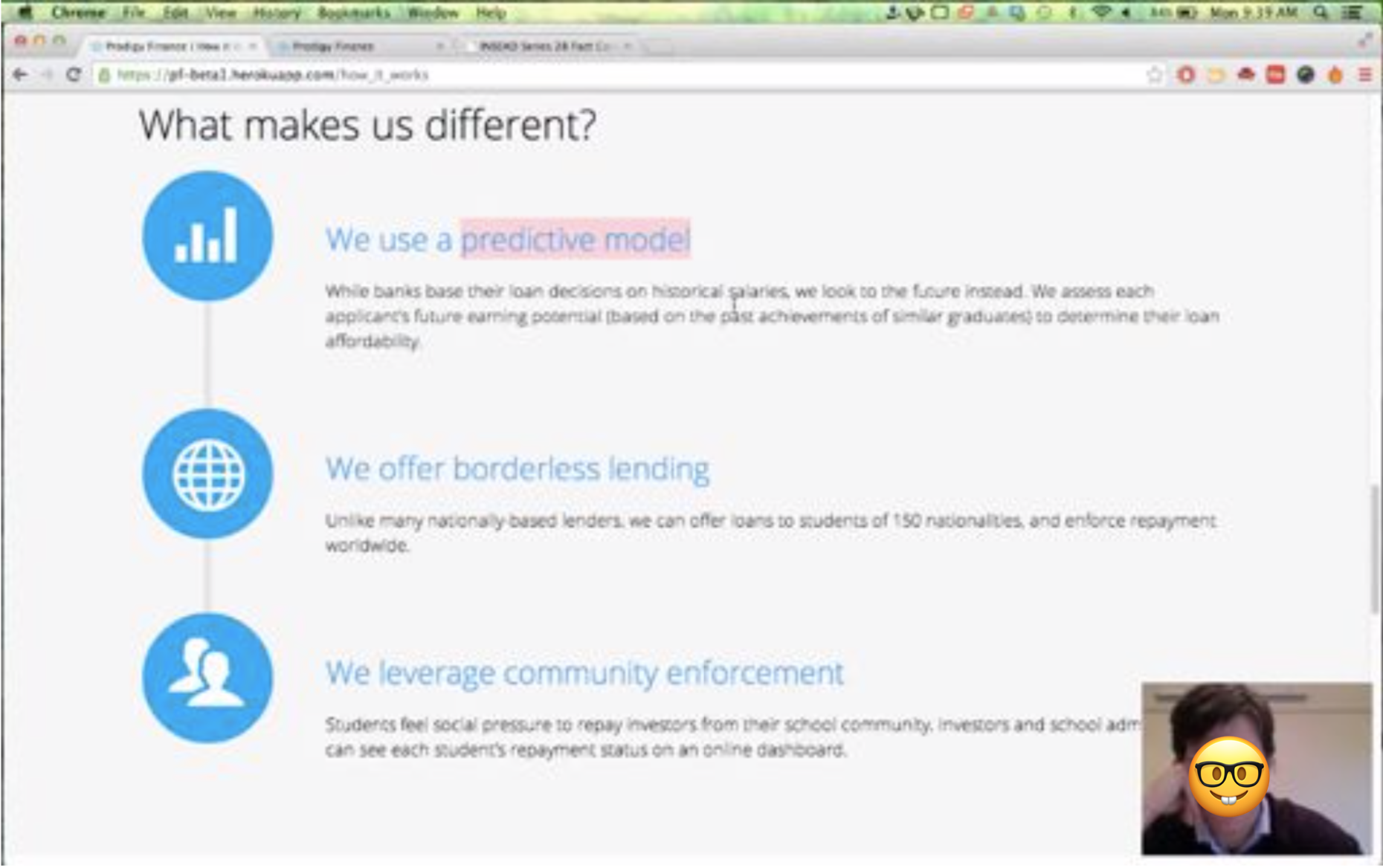 Pictured: I led user testing of the new Prodigy Finance website. Here is a screenshot of a user test with an (anonymized) customer. During these sessions, we learned many things, including that the FAQs were not prominent enough.